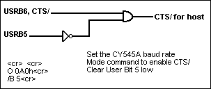 When a Mode command is issued with MB5 set to one, the CY545A enables the CTS/ function on the USRB6 (the CTS function is not available on older parts prior to the CY545A). After any reset, this function is disabled, and USRB6 is high, so the CTS/ signal is off. A Mode command must be issued to the CY545 before the CTS/ function is enabled.